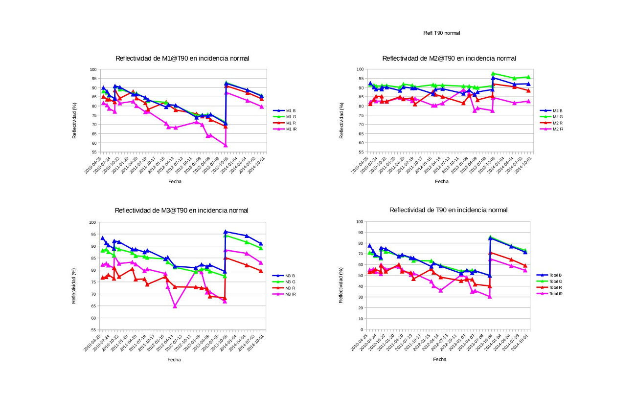 Para cada uno de los tres espejos del T90 se lleva a cabo periódicamente medidas de reflectividad. Las cuatro gráficas corresponden a los espejos M1 (primario), M2 (secundario) M3 (terciario) y la reflectividad del telescopio desde Abril de 2010 a Octubre de 2014. Las medidas se han llevado a cabo a diferentes longitudes de onda: azul (470nm), verde (530nm), rojo (650nm) e infrarrojo (880nm).